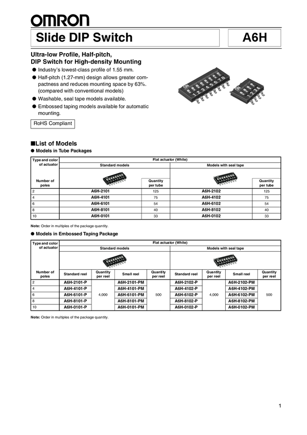 Switch DIP OFF ON SPST 8 Raised Slide 0.025A 24VDC Gull Wing 1000Cycle 2.54mm SMD Embossed T/R