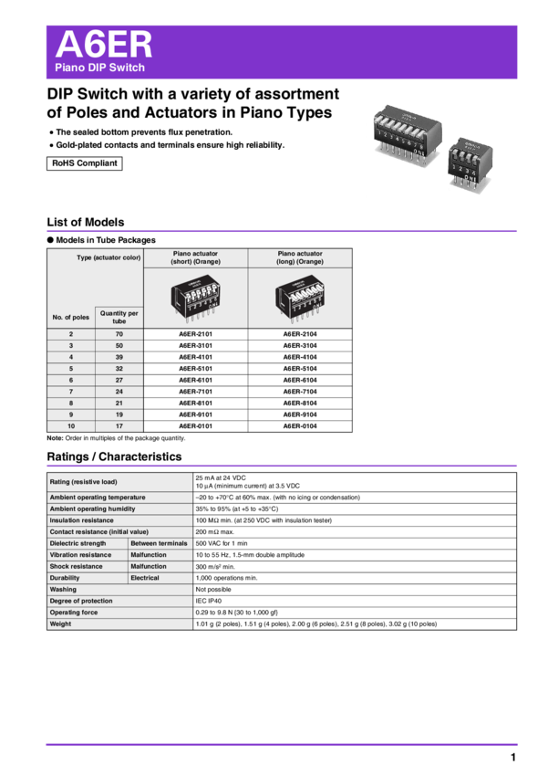 Switch DIP ON OFF SPST 8 Piano 0.025A 24VDC PC Pins 1000Cycle 2.54mm Thru-Hole Tube