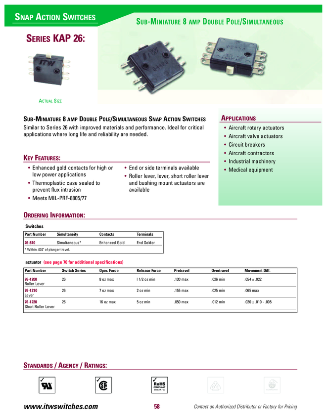 Switch Snap Action N.O./N.C. DPDT Pin Plunger Solder 8A 115VAC 28VDC 5N Screw Mount