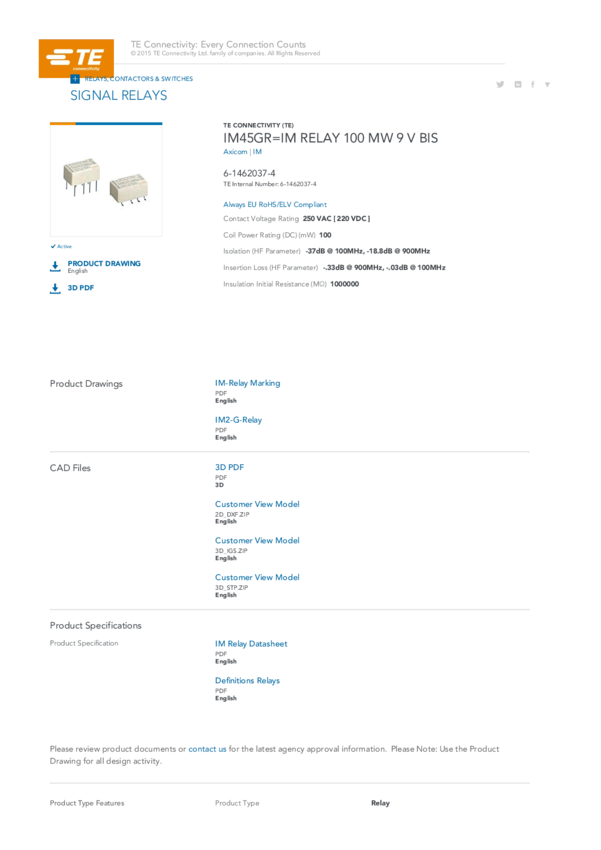 Electromechanical Relay DPDT 2A 9VDC 810Ohm Through Hole