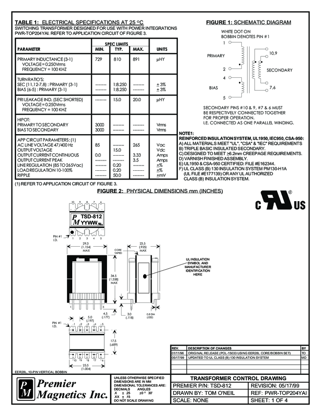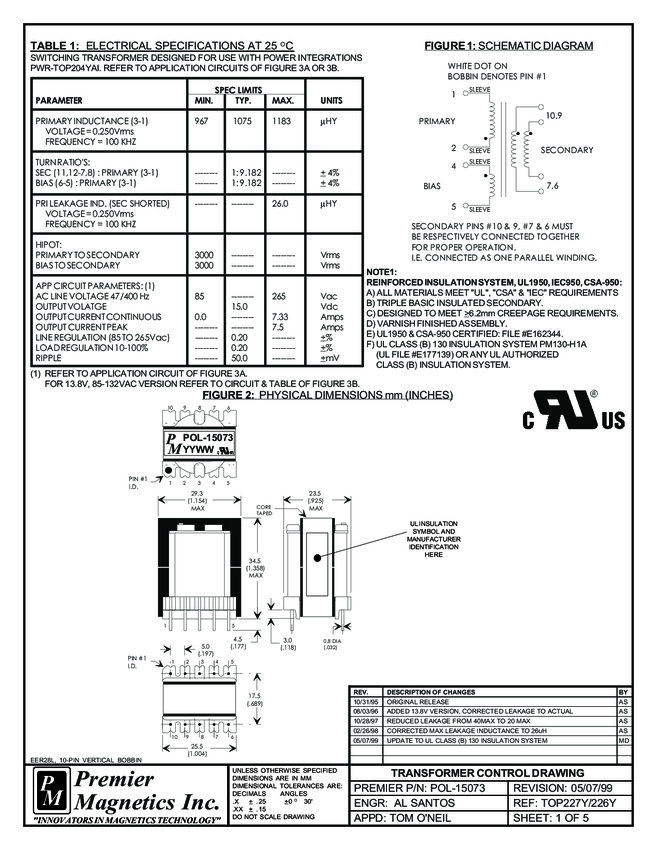Power Transformer 9.812:1/9.812:1 Single+Auxilary Prim. Dual Sec. 265V Prim. 15V Sec. Through Hole