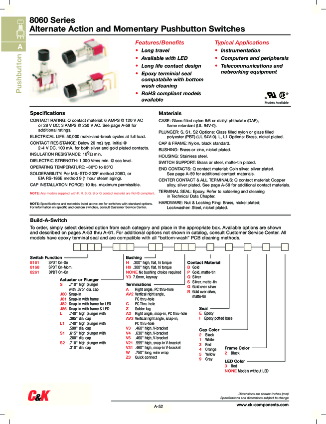 Switch Push Button ON ON SPDT Round Plunger 20VAC 20VDC 0.4VA Alternate Contact PC Pins Panel Mount/Through Hole