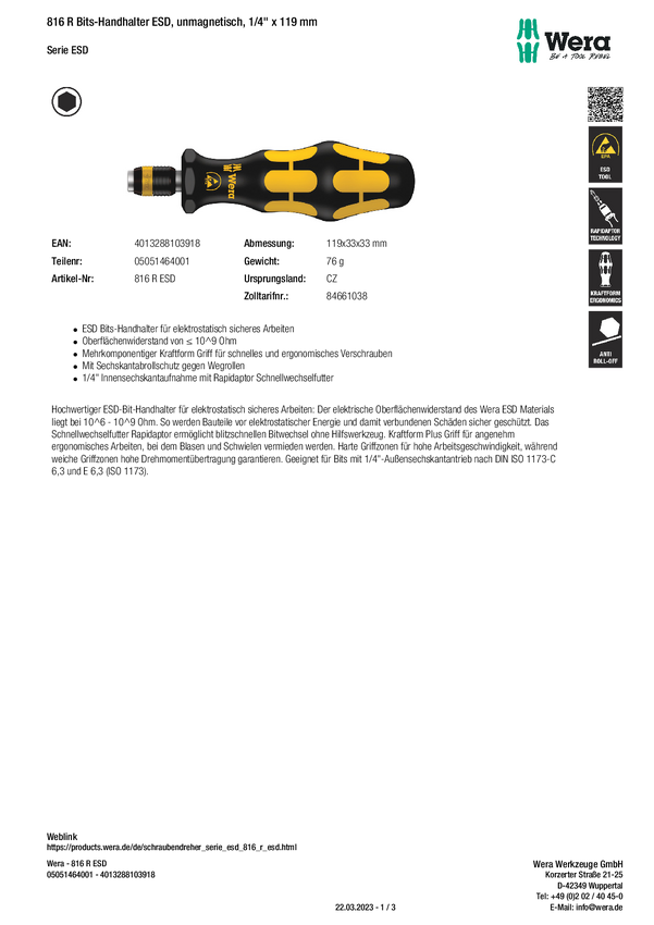 Uchwyt do bitów Wera 816 R ESD 05051464001