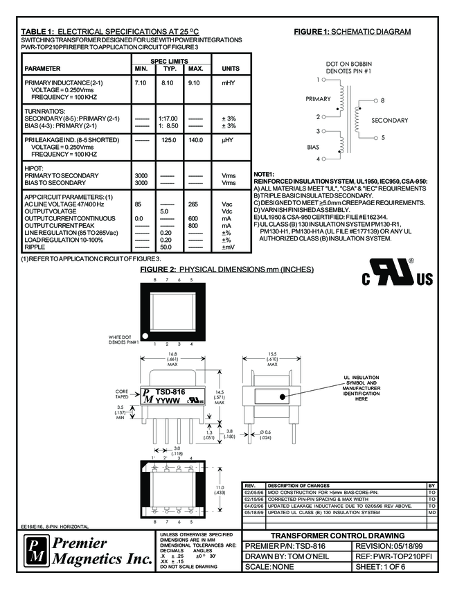 Power Transformer 17:1/8.5:1 Single+Auxilary Prim. Single Sec. 265V Prim. 5V Sec. Through Hole