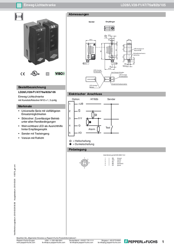 Bezzwrotny czujnik fotoelektryczny Pepperl+Fuchs LV28-F1/47/82b/105 109978 Przełącznik (Jasność / Ciemność) 1 szt.