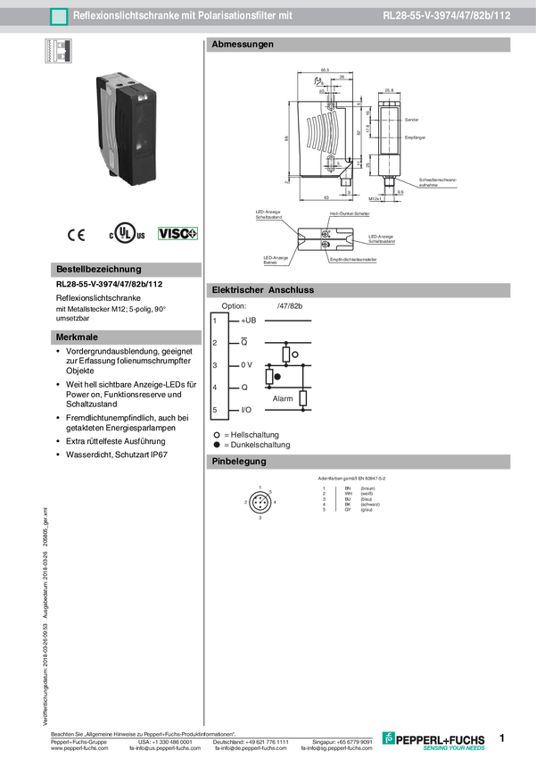 Fotokomórka odbiciowa Pepperl+Fuchs RL28-55-V-3974/47/82b/112 205805 Polaryzator, Przełącznik (Jasność / Ciemność) 1 szt