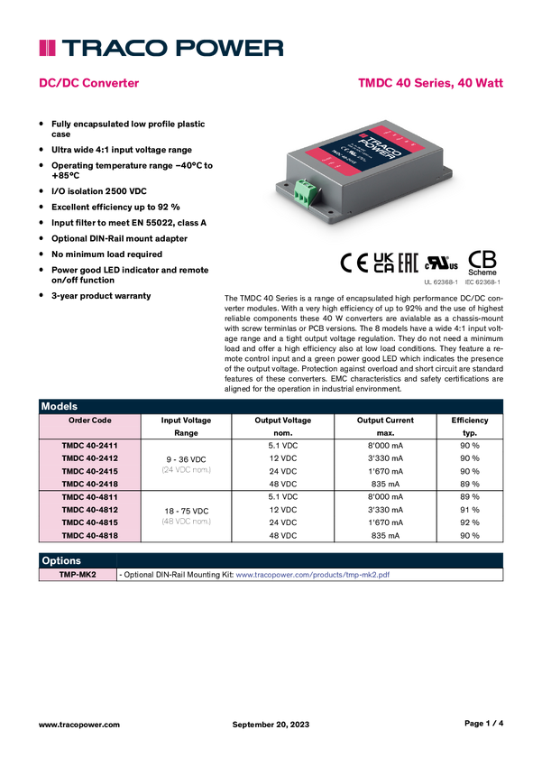 TracoPower TMDC 40-4818 Moduł przetwornicy DC/DC 48 V/DC 48 V/DC 835 mA 40 W Ilość wyjść: 1 x Content 1 szt.