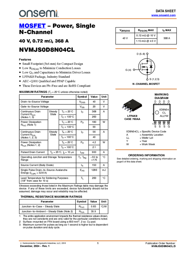 Power MOSFET 40 V, 0.83mΩ, 336 A, Single N-Channel
