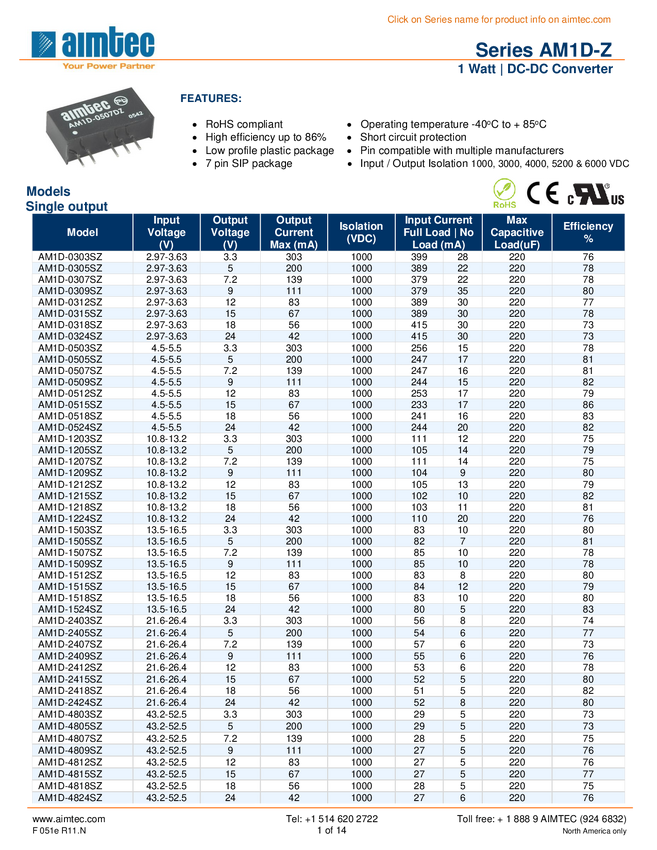 Przetwornik; DAE1-0513 / AM1D-0512SZ; DC/DC; 1W; Uwej: 4,5÷5,5V; 12VDC; Iwyj: 83mA; SIP7-4p ; 2,3g