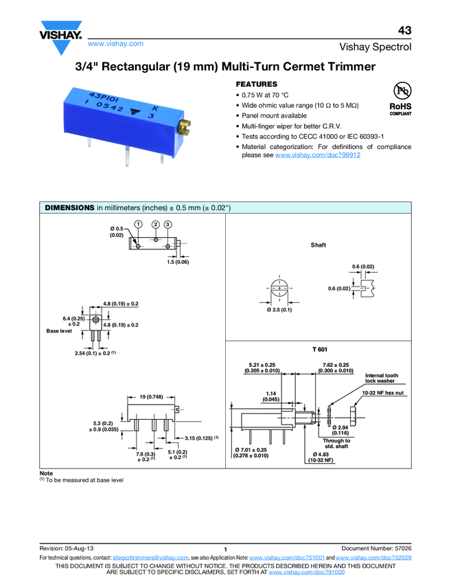 Res Cermet Trimmer 1M Ohm 10% 3/50W 15(Elec)/18(Mech)Turn 4.83mm Pin Panel Mount Box