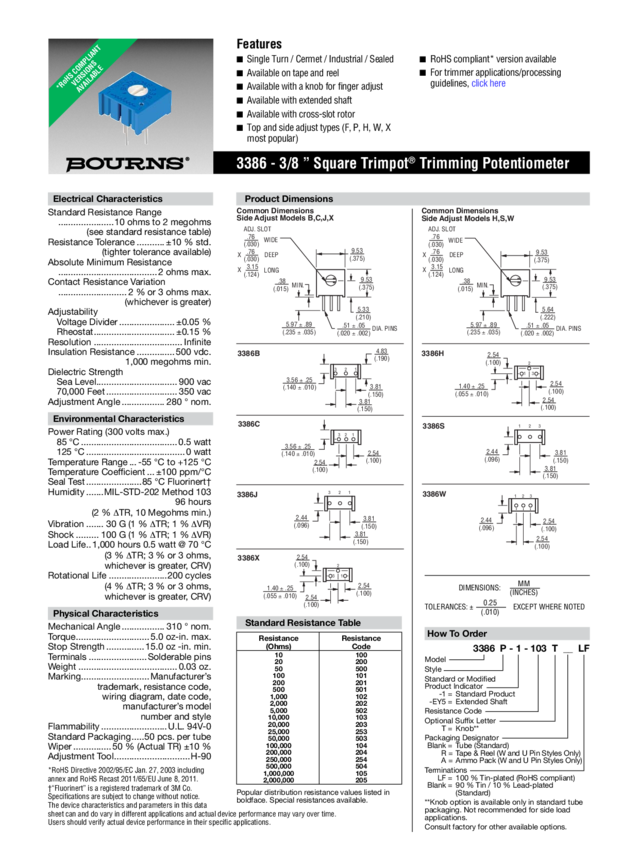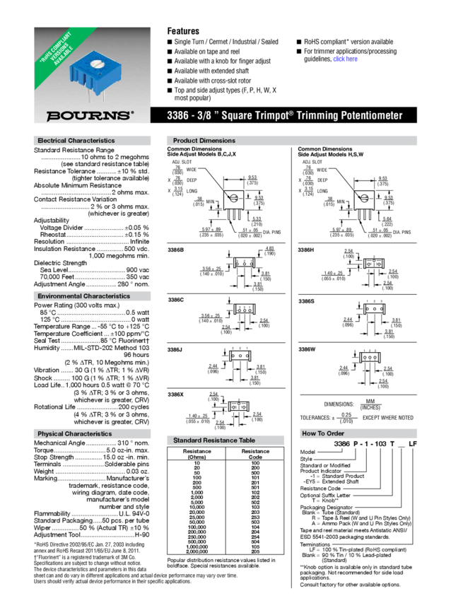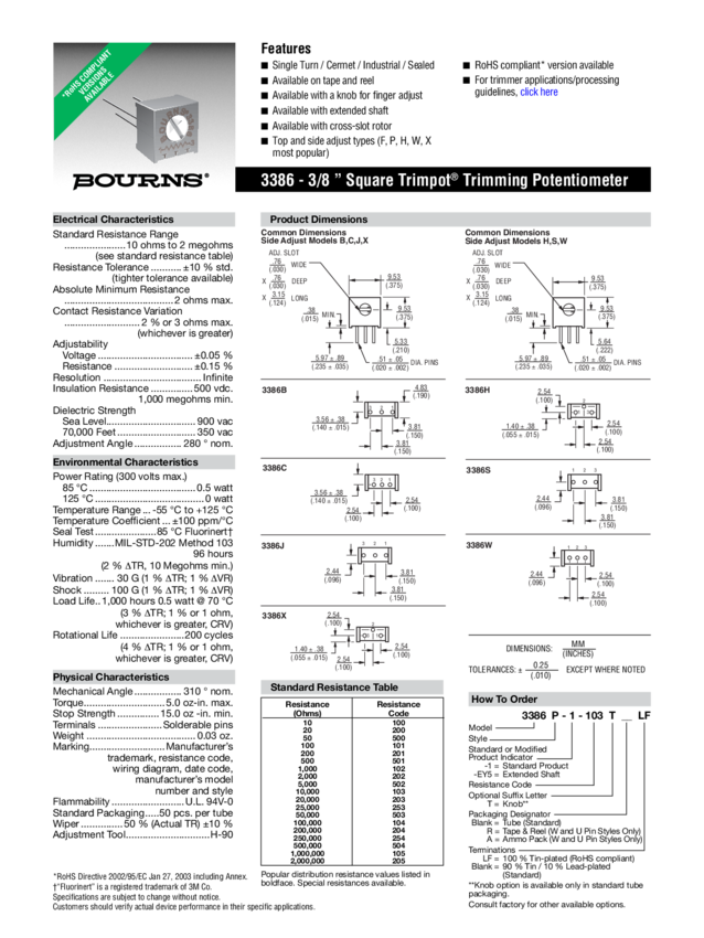 Res Cermet Trimmer 2.5K Ohm 10% 1/2W 1(Elec)/1(Mech)Turn 3.15mm (9.53 X 9.53 X 4.83mm) Pin Thru-Hole Tube