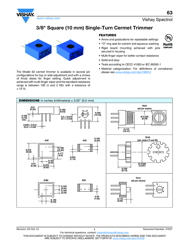 Res Cermet Trimmer 10K Ohm 10% 1/2W 1(Elec)/1(Mech)Turn (9.53 X 9.53 X 4.83mm) Pin Thru-Hole Bulk