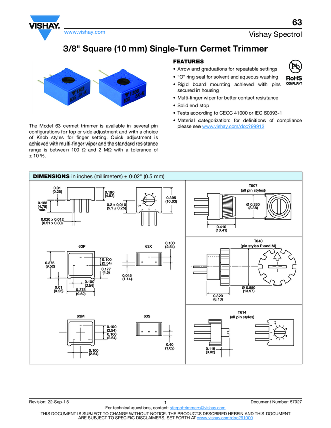 Res Cermet Trimmer 2.2K Ohm 10% 1/2W 1(Elec)/1(Mech)Turn 3.05mm (9.53 X 9.53 X 4.83mm) Pin Thru-Hole Tube