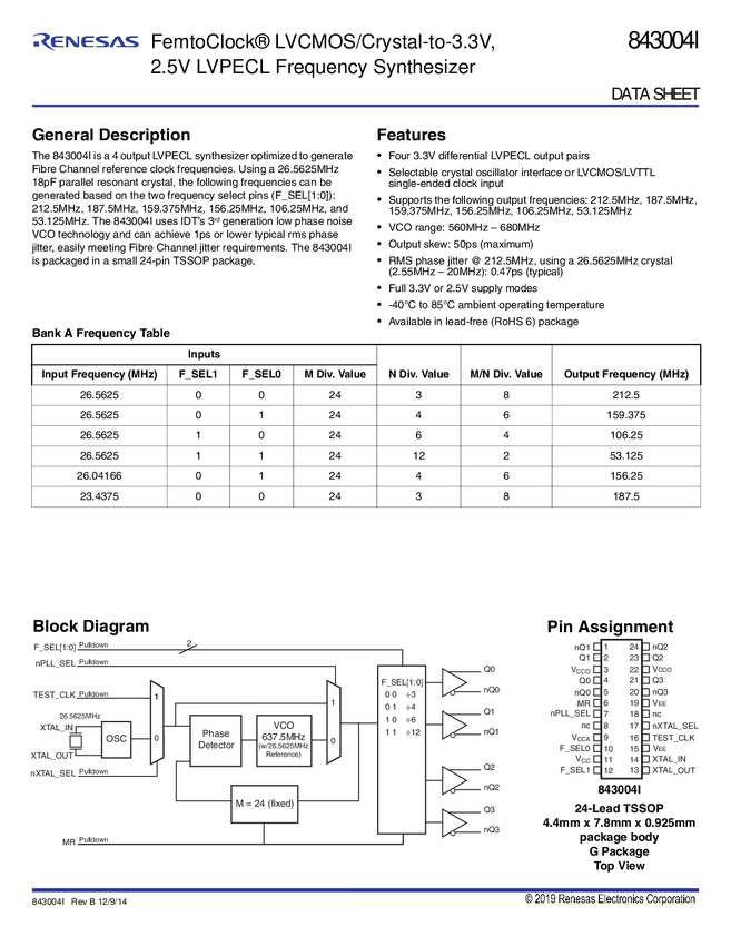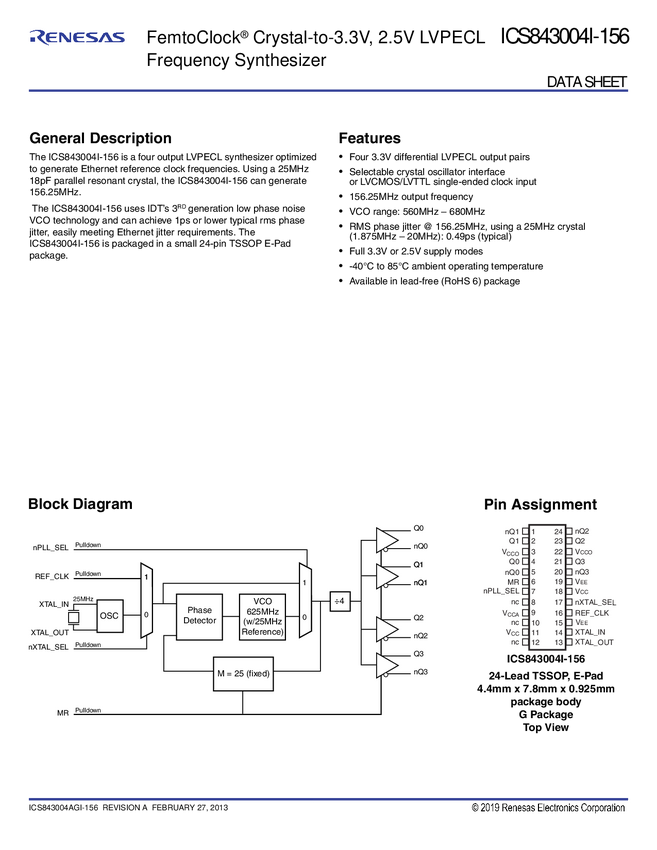 FemtoClock Crystal-to-3.3V,2.5V LVPECL Frequency Synthesizer