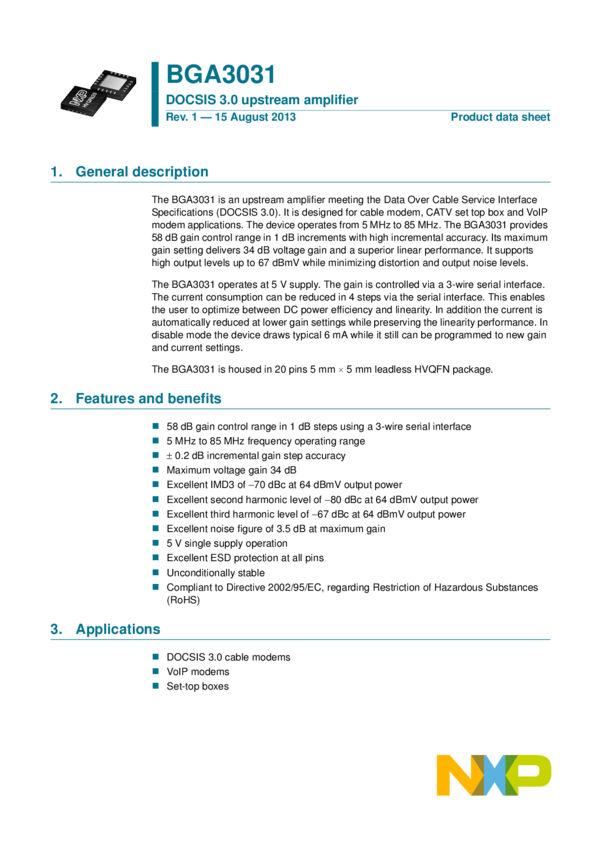 RF Amp Chip Single Upstream Amplifier 85MHz 5V 20-Pin HVQFN T/R