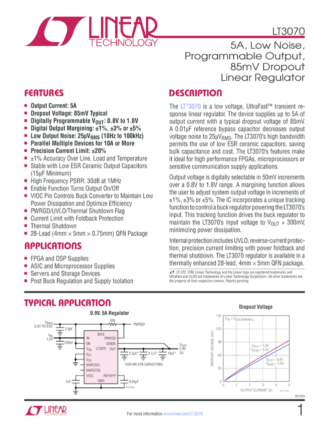 5A, Low Noise, Programmable Output, 85mV Dropout Linear Regulator with Analog Margining