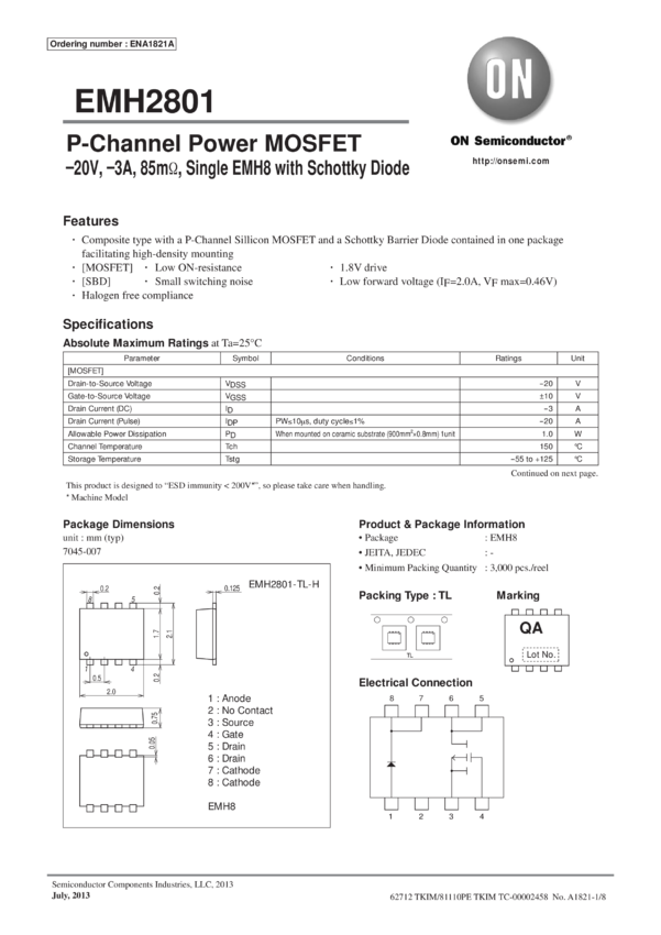 P-Channel Power MOSFET, -20V, -3A, 85mOhm, Single EMH8 with Schottky Diode