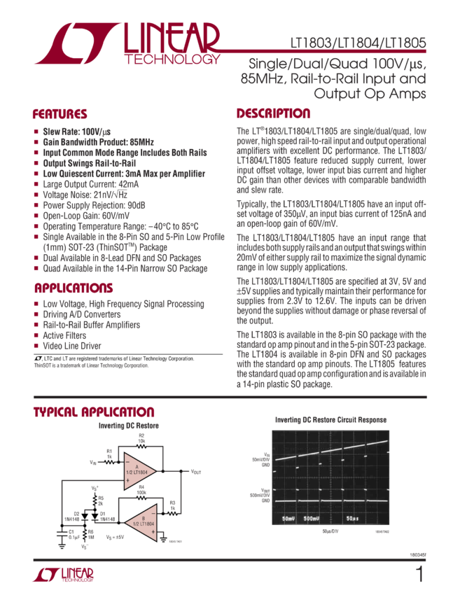Single/Dual/Quad 100V/µs, 85MHz, Rail-to-Rail Input and Output Op Amps