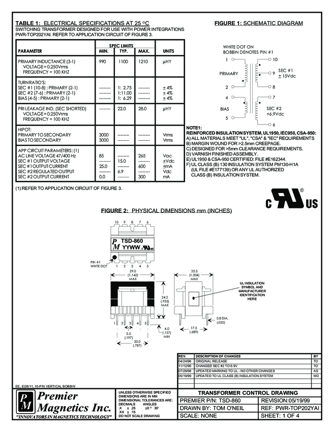 Power Transformer 2.75:1/11:1/6.29:1 Single+Auxilary Prim. Triple Sec. 265V Prim. 15V/6.9V Sec. Through Hole