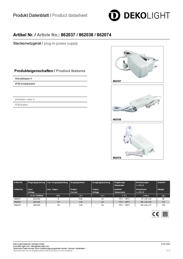 Zasilacz wtyczkowy, stałonapięciowy Deko Light Mia, CV 250 mA 6 W