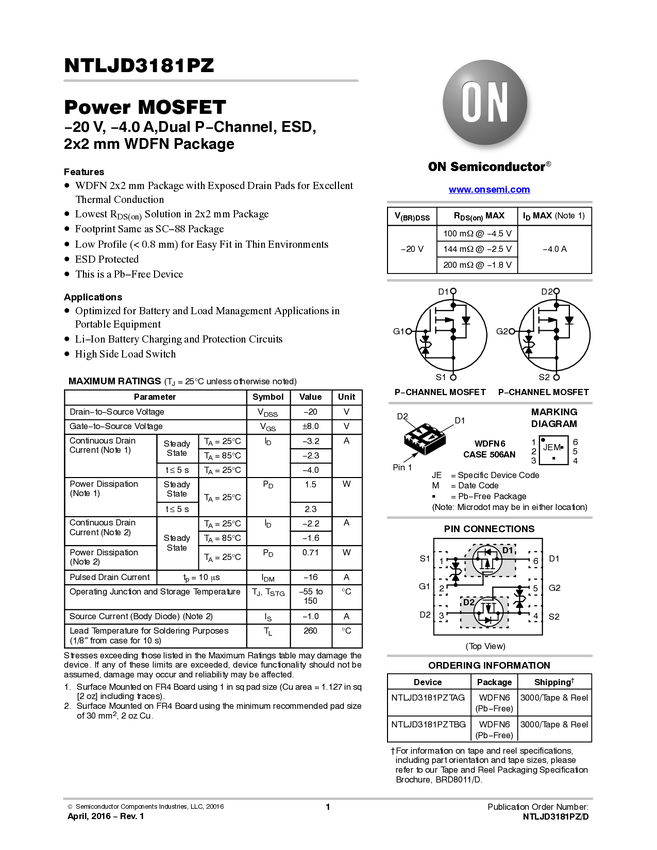 Power MOSFET 20V 3.2A 100 mOhm Dual P−Channel WDFN6 with ESD