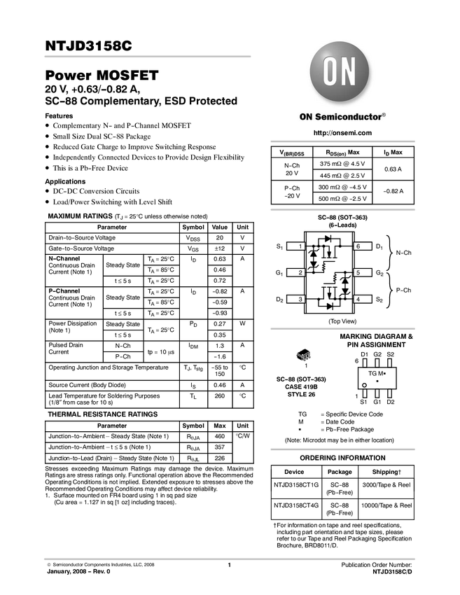 Small Signal MOSFET 20V 630mA 375 mOhm Dual Complementary SC−88/SC70−6/SOT−363