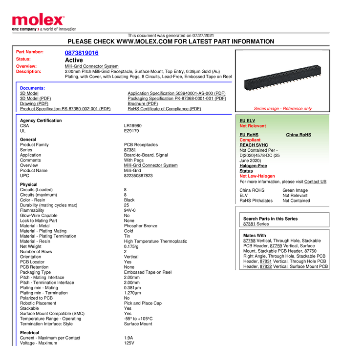 Molex 873819016 Listwa kołkowa, żeńska, do wbudowania, standardowa, piny: 8, 1.9 A, 1 szt.