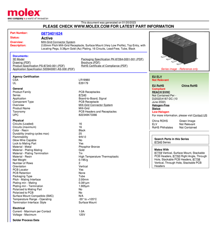 Molex 873401624 Listwa kołkowa, żeńska, do wbudowania, standardowa, piny: 16, 1 szt.