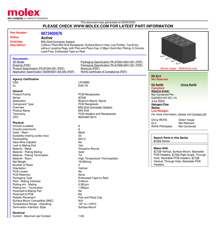 Molex 873400676 Listwa kołkowa, żeńska, do wbudowania, standardowa, piny: 6, 1 szt.