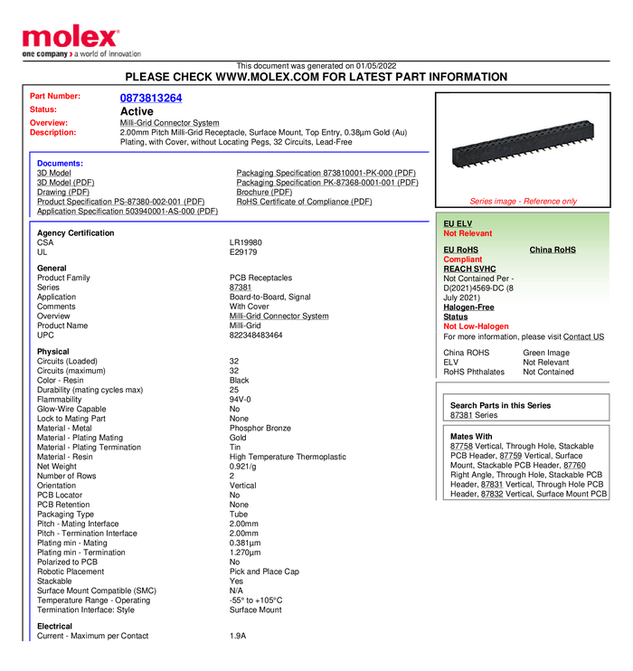 Molex 873813264 Obudowa złącza pin żeńskiego na PCB, 1 szt.