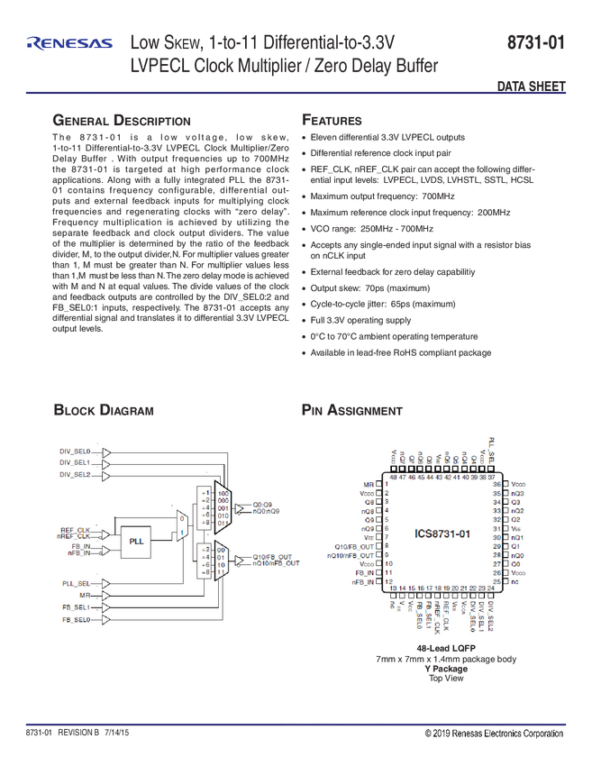 Low Skew, 1-to-11 Differential-to-3.3V LVPECL Clock Multiplier / Zero Delay Buffer