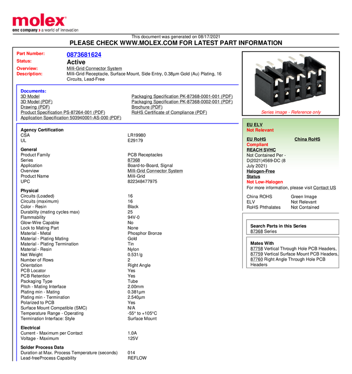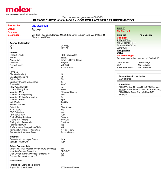 Molex 873681424 Listwa kołkowa, żeńska, do wbudowania, standardowa, piny: 14, 1 A, 1 szt.