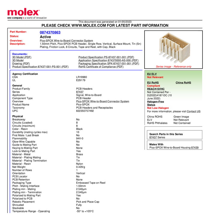 Molex 874370863 Listwa połączeniowa Wymiary siatki: 1.50 mm Ilość pinów: 8 Ilość rzędów: 1 1 szt. taśma na dużej rolce