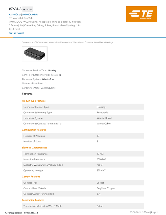 TE Connectivity TE AMP AMPMODU Mod I 1-87633-0, 1x -02050007148333