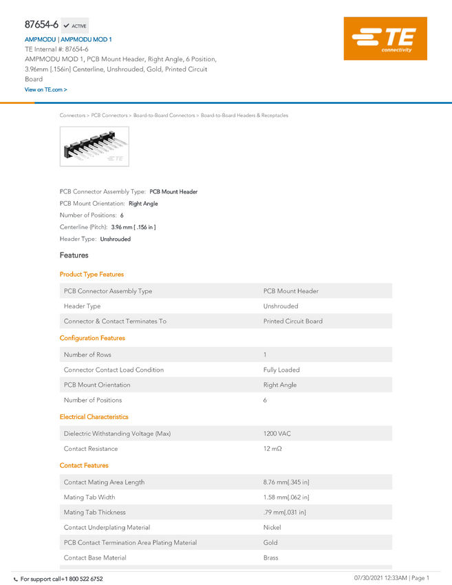 TE Connectivity 87654-6 TE AMP AMPMODU Mod I, 1 szt.