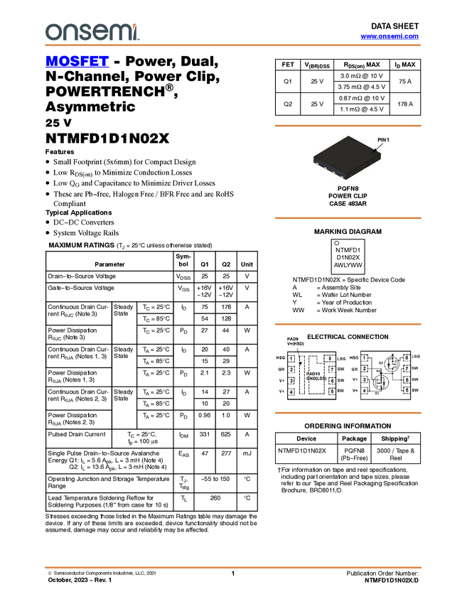 Dual Power MOSFETs, N-Channel, 25V, 3.0mΩ/75A, 0.87mΩ/178A, Asymmetric, Power Clip Dual 5x6