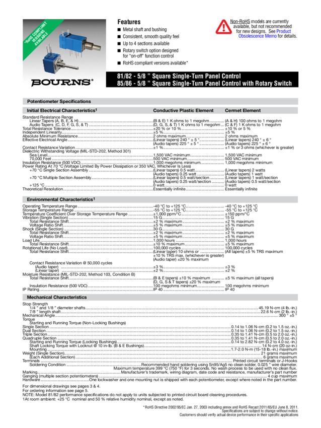 Potencjometr przewodzący plastik, wykonaie specjalne modelu serii 380 2W ( nie Mil wersja modelu RV4 )lin 3% (dla wersji std 312 st) ośka 6,35 mm dł.15,88mm; gwint 3/8-32NEF-2A 6,35 średnica 27,79 mm; gł. 14,3mm; Bushing - Gwint 6,35mm; wyprowadzenia z boku; kąt mechaniczny 312 stopni - ze stopami; kąt elektryczny 276 stopmi (133 +10 dead band +133 st) Rez. 5 Kohm charakterystyka liniowa typ: S-13: 1-045%+DB+55-90% Potencjometr ma odczep CT i Daad Band Katalogowo podają 112 stopni, ale to błąd w katalogu ma