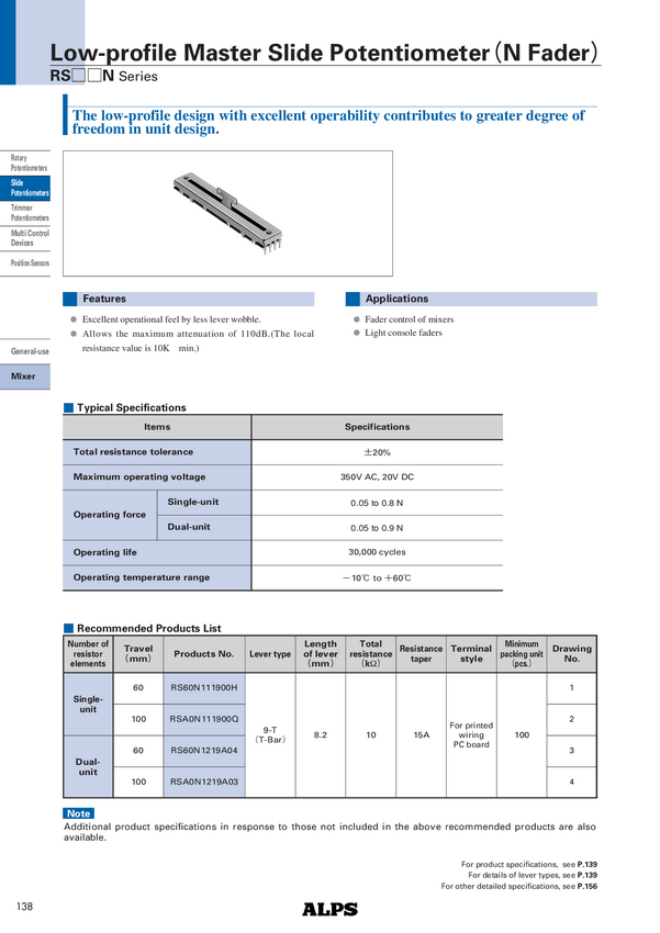 Potencjometr suwakowy Panasonic, 10 kohm; stereo - dual Travel 60mm; 88mm x 15 mm x 8mm Potencjometr audio - taper A 10kohm A12T; podobny RS60N1219A04-ALPS