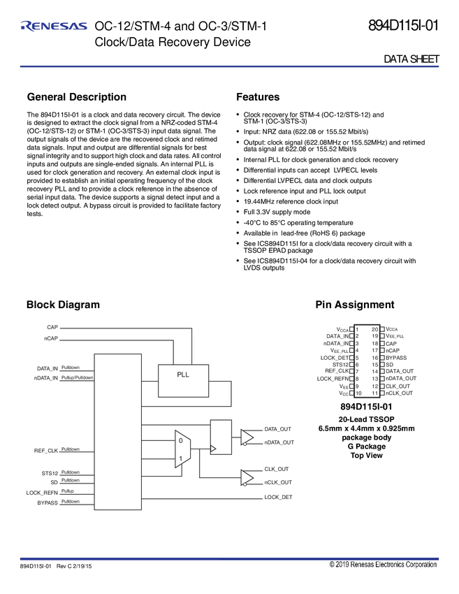 OC-12/STM-4 AND OC-3/STM-1 CLOCK/DATA RECOVERY DEVICE