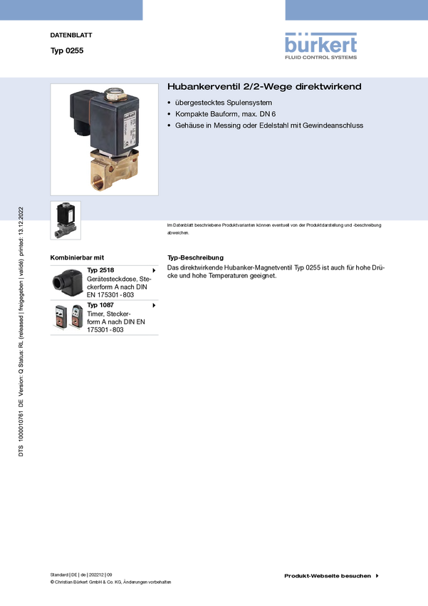 Zawór magnetyczny Bürkert 0255 89404, 0 bar (max)
