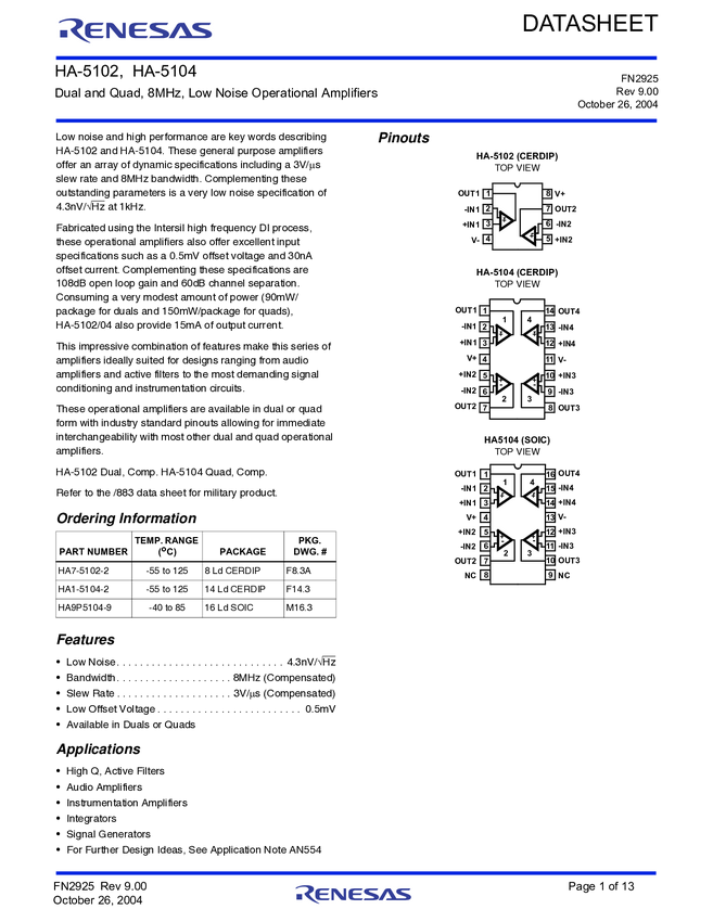 Dual and Quad, 8MHz and 60MHz, Low Noise Operational Amplifiers