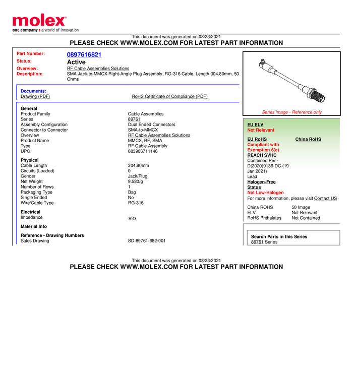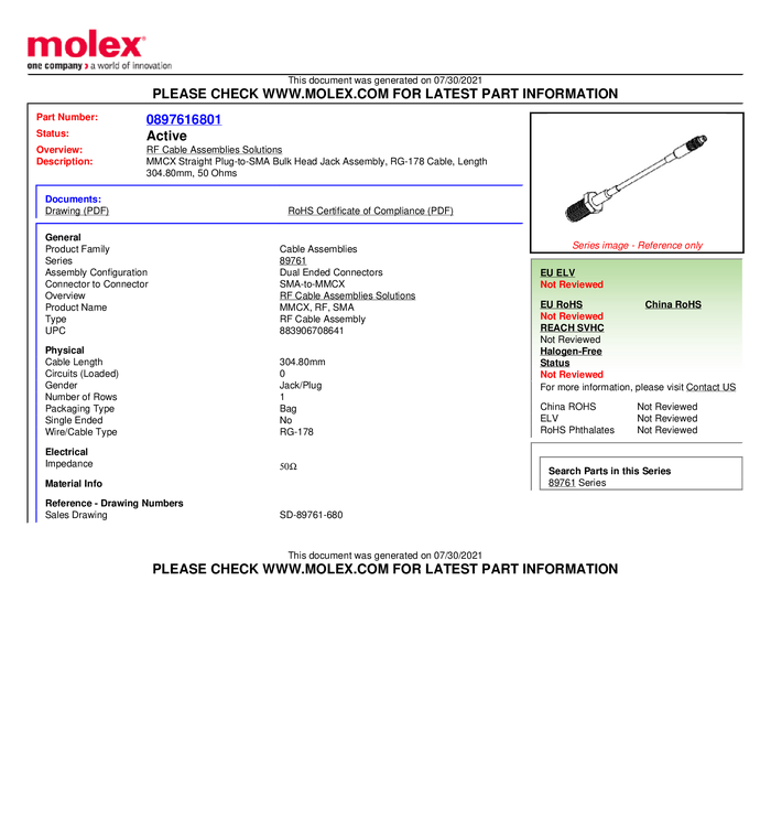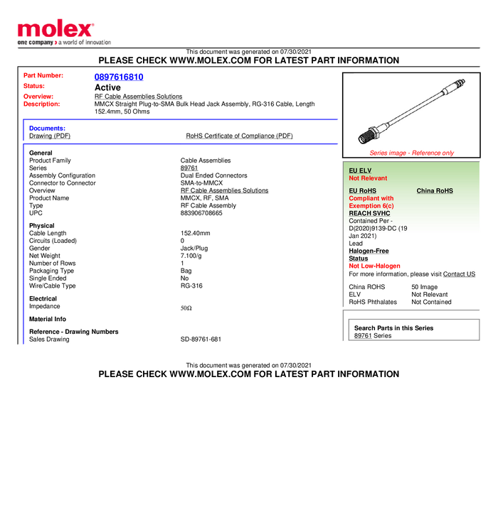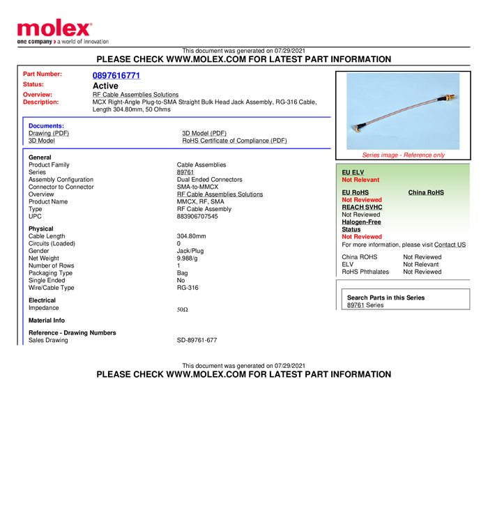 Złącze SMA Molex Molex MOL DataCom & Specialty 897616771 gniazdo, złącze męskie 50 Ω 1 szt.