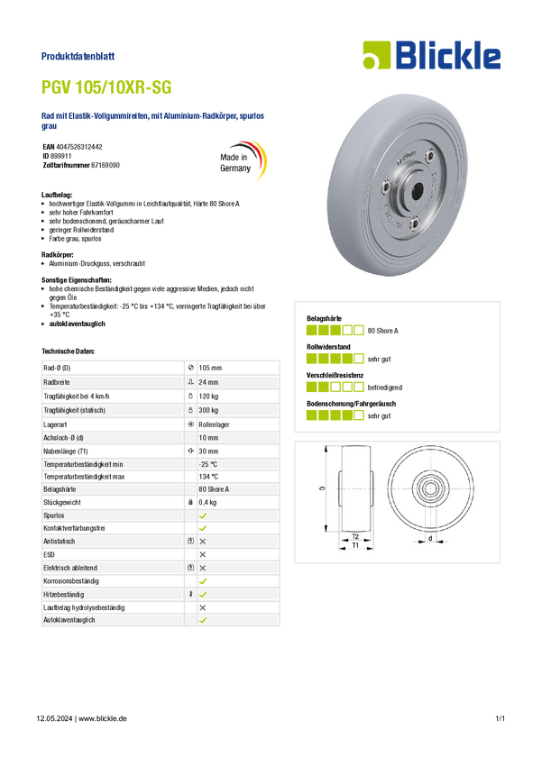 Blickle 899911 PGV 105/10XR-SG Koło Średnica koła: 105 mm Maksymalne obciążenie: 120 kg 1 szt.