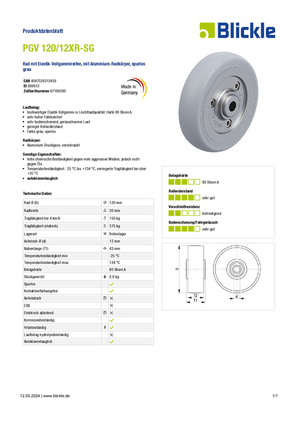 Blickle 899912 PGV 120/12XR-SG Koło Średnica koła: 120 mm Maksymalne obciążenie: 150 kg 1 szt.