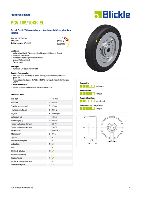 Blickle 899905 PGV 105/10XR-EL Koło Średnica koła: 105 mm Maksymalne obciążenie: 120 kg 1 szt.