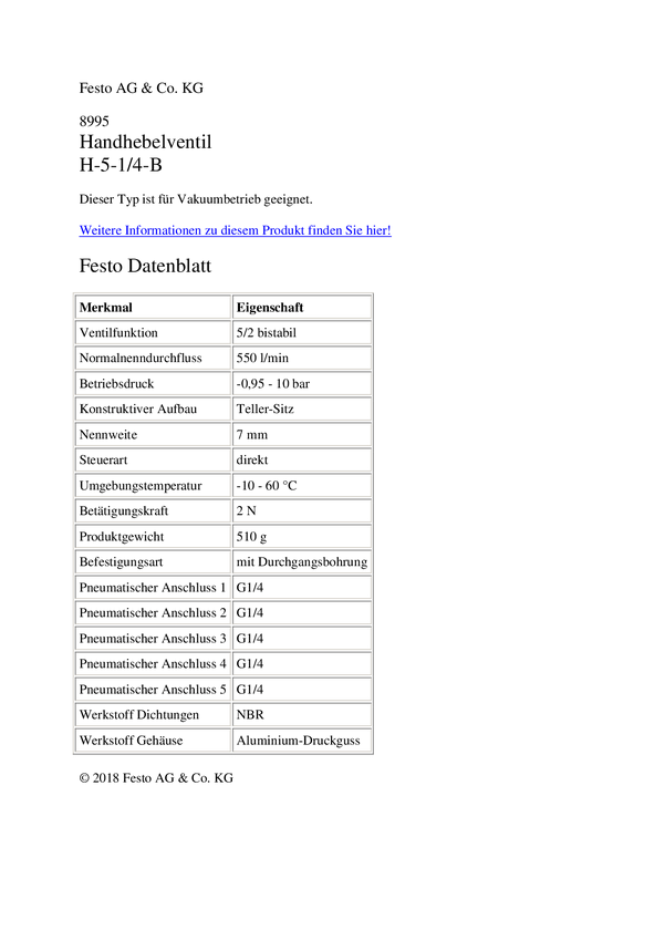 FESTO Zawór ręczny dźwigniowy H-5-1/4-B 8995 -0.95 do 10 bar 1 szt.