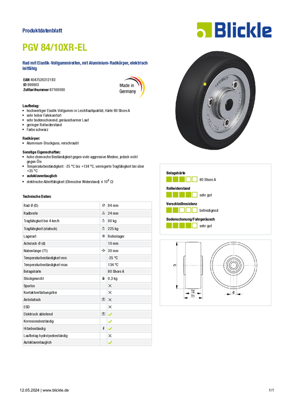 Blickle 899903 PGV 84/10XR-EL Koło Średnica koła: 84 mm Maksymalne obciążenie: 90 kg 1 szt.