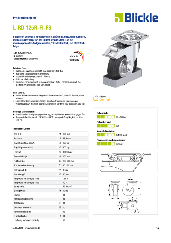Blickle 899629 L-RD 125R-FI-FS Rolka obrotowa z blachy stalowej Średnica koła: 125 mm Maksymalne obciążenie: 120 kg 1 sz