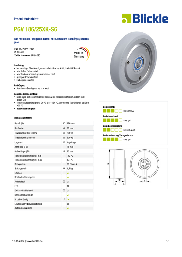 Blickle 899914 PGV 186/25XK-SG Koło Średnica koła: 186 mm Maksymalne obciążenie: 200 kg 1 szt.
