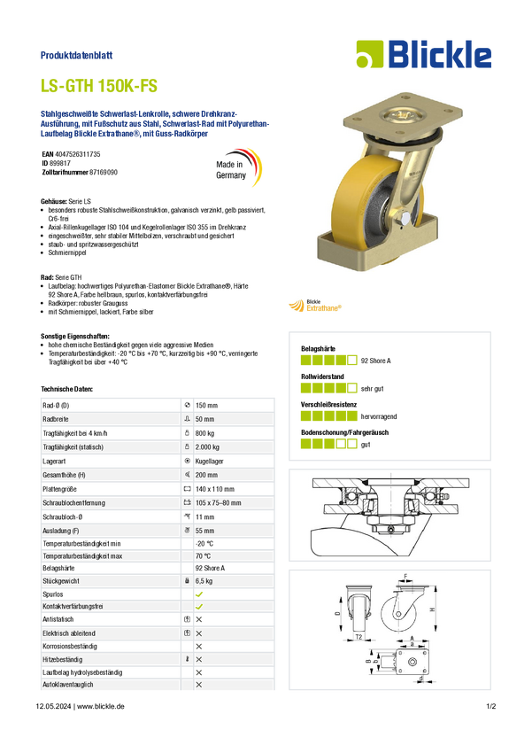 Blickle 899817 LS-GTH 150K-FS Koło obrotowe do dużych obciążeń Średnica koła: 150 mm Maksymalne obciążenie: 800 kg 1 szt